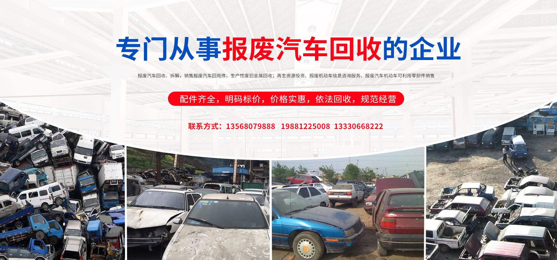 我公司在報廢汽車回收拆解中,認真貫徹執(zhí)行國家法律法規(guī),嚴格執(zhí)行國務院令第307號,積極開展行業(yè)自律,依法回收,規(guī)范經(jīng)營,從源頭上控制了報廢汽車整車、拼裝車、“五大總成”等上路和重新流入市場的現(xiàn)象,為緩解我市資源短缺,減輕環(huán)境污染,促進資源循環(huán),維護人民群眾生命財產(chǎn)安全和道路交通安全起到了巨大的作用。